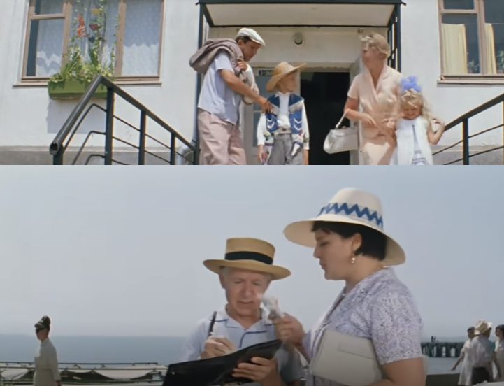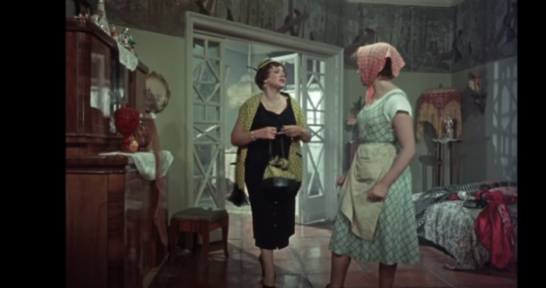 «Три плюс два». Две стильные красавицы. У героини Кустинской сумка-корзина. Не пляжная, нет. Она с ней отправилась в город покупать подруге лекарство выписанное ветеринаром. То было время самых невероятных сумок-корзин.