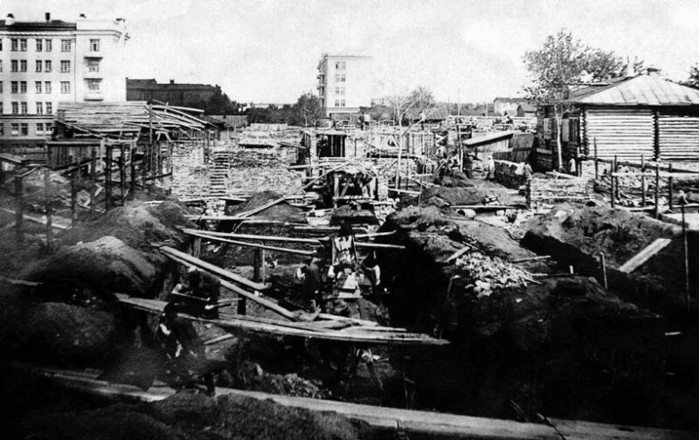 Закладка фундамента при строительстве общежития педагогического института и педтехникума. 1935 — 1936.