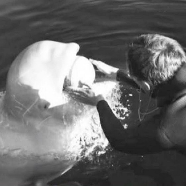 Боевая белуха во время тренировки с дрессировщиком. Бухта Витязь, Японское море, 1982 год