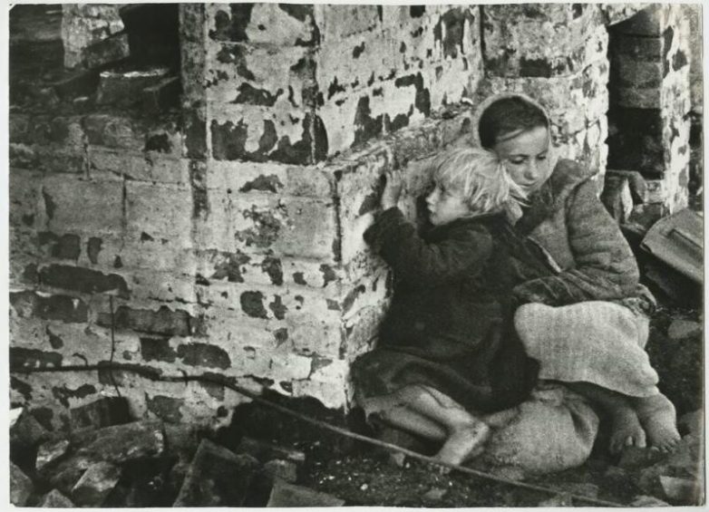 Дина и Надя Чапкевич у своего дома, сожженного фашистами. Белоруссия, деревня Волынцы, 1943 год. Иван Шагин.