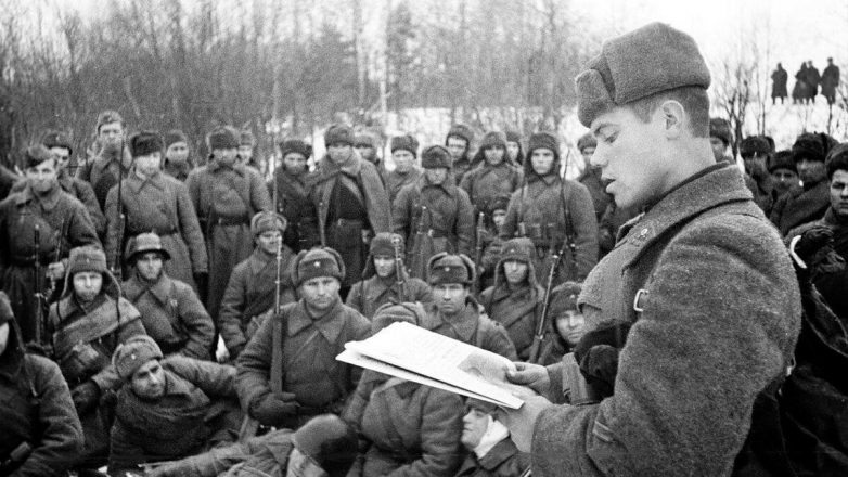 Советский командир зачитывает речь Сталина во время боев за Москву.