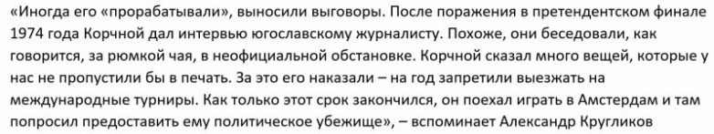 Даже Корчной, хоть и сбежал, был представителем могучей шахматной державы — СССР. Настолько могучей, что до сих пор не до конца «убита» школа чемпионов мира. Не все тогда решила деньги, а отношение государства к народу, к поддержанию настоящих талантов, а не вонючих блогеров.