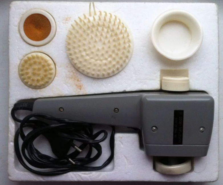 Приборы, которые массово начали выпускаться во второй половине 50-х гг., состояли из пластмассового корпуса с ручкой, на которой располагался выключатель. На наружной части корпуса было крепление для пяти сменных насадок, которые, собственно, и были основной рабочей частью этого прибора, обеспечивающие массажный эффект.