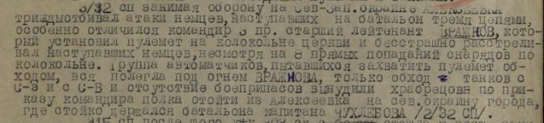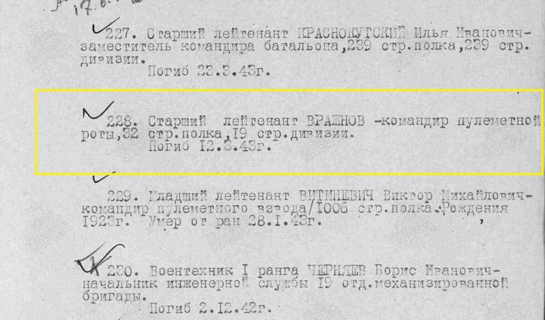 Однако, интернет-пользователем Валентином Фёдоровичем Мозолевым на архивном сайте «Память народа» была найдена карточка военнопленного на имя старшего лейтенанта Вражнова Николая Филипповича 1918 года рождения, служившего в том самом 32-м полку стрелковой дивизии.
