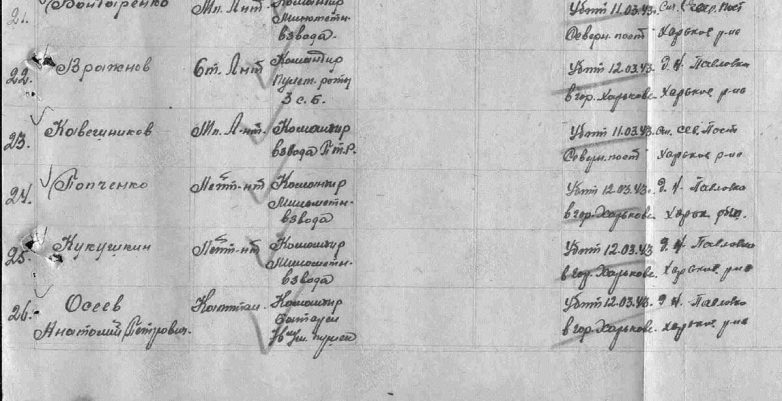 Дело в том, что в советских документах (прим. — журналах боевых действий 19-й сд, а также в приказах об исключении из списков Красной Армии) он называется без имени и отчества. И в списках потерь указывается, что офицер пал 12 марта 1943 года у деревни Павловка Харьковского района.