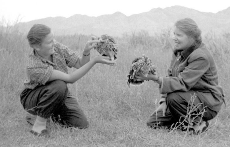 Советские геологи Нинель Афанасьева и Елена Жукова в Китае играют с птенцами хищной птицы. 1956 год. Фотограф Владимир Фараджев.