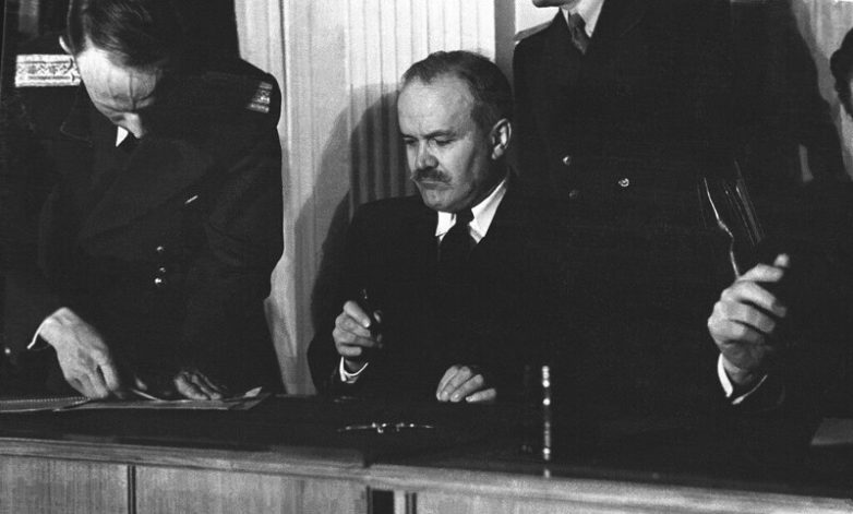 Вячеслав Михайлович Молотов (нарком иностранных дел СССР) и Министр иностранных дел Великобритании Энтони подписывают Протокол работы Крымской конференции (Ялтинской конференции). 11 февраля 1945 года.