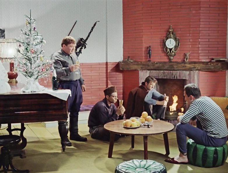 «Джентльмены удачи», режиссер Александр Серый, Мосфильм, 1971 год.То, что советские зрители увидели в фильме, было даже не квартирой профессора, а его загородной дачей. Это сегодня шикарные особняки за городом ни у кого не вызывают удивления, а в советское время дачи, как правило, были всего лишь скромными домиками, куда граждане приезжали огородничать и куда отправляли отслужившие свой век или вышедшие из моды вещи. На даче профессора из фильма «Джентльмены удачи» все увидели совершенно другой быт. Во -первых, камин. По нашим меркам простенький, для советских граждан он был диковинкой – дачные домики отапливались буржуйками или простыми печками.