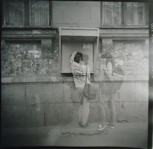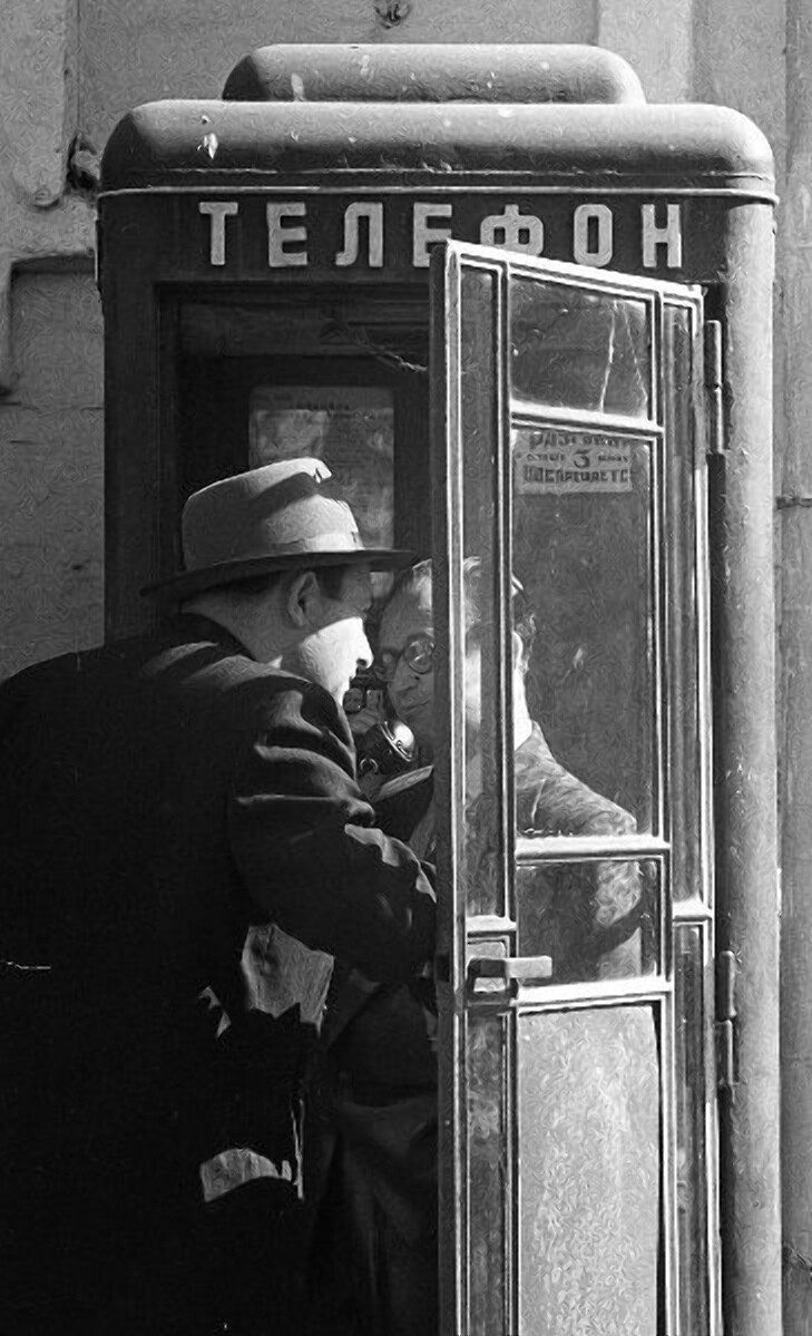 У телефонной будки. 1960-е. Автор: Всеволод Тарасевич.