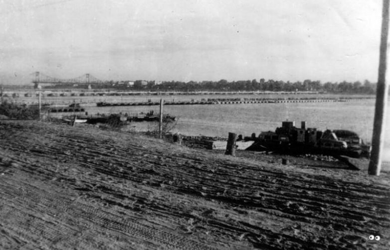 Так в 1942 году выглядела Днепровская набережная. Вдали — разрушенный Цепной мост
