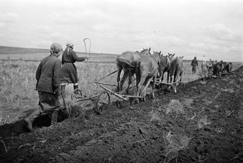 Весенняя вспашка в Спасовской бригаде Боярского колхоза Кудымкарского района. Ф. Будкевич, 1943 год, Молотовская обл., КБУК «Коми-Пермяцкий краеведческий музей им. П. И. Субботина-Пермяка».