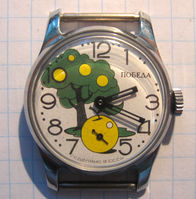 «Победа» тоже не отставала — циферблат украшался картинкой яблони с яблоками, корабля, телефонного аппарата, старинного автомобиля, бабочки, ну и упомянутых выше американских мультяшных героев.