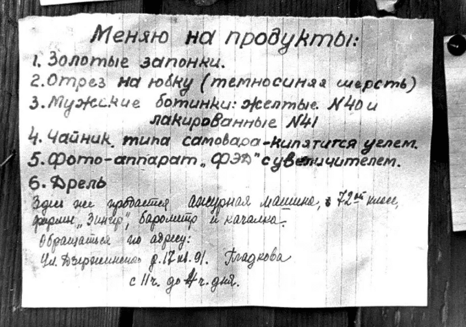 Очень скоро магазины опустели и их витрины были заколочены. После этого в блокадном городе перестал ходить общественный транспорт, работать уличное освещение, а потом и вовсе пропало электричество. Одновременно с этим как грибы после дождя начали появляться точки, где людям предлагали обменять ценные вещи на продукты.