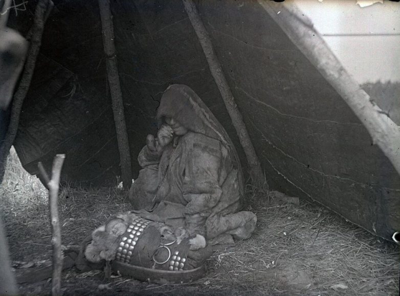 Роженица в специально отведенном для неё чуме на время родов и ухода за новорожденным. Неизвестный автор, 1936 год, Ямало-Ненецкий АО, Кунсткамера.