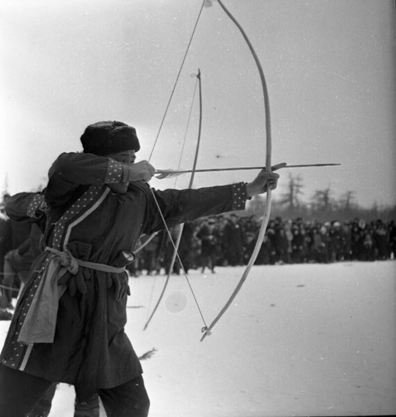 Бурятский спортивный народный праздник Сурхарбан. Стрельба из лука. 1938 год. Автор: Георгий Липскеров. Бурят-Монгольская АССР.