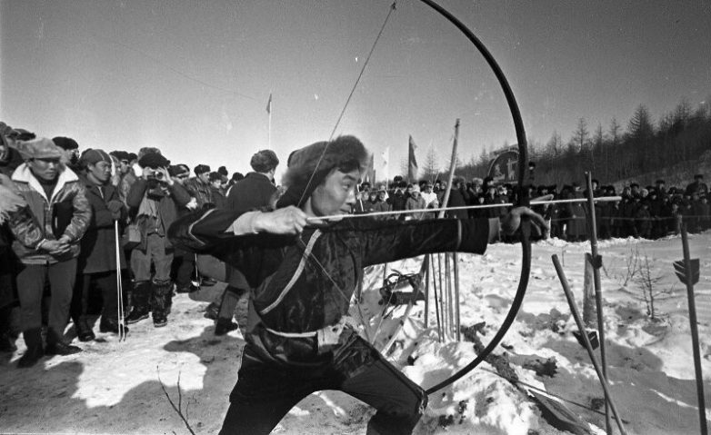 На праздник. Соревнования по стрельбе из лука. Февраль 1968 года. Автор: Юрий Садовников. Сахалинская область, пгт. Ноглики.