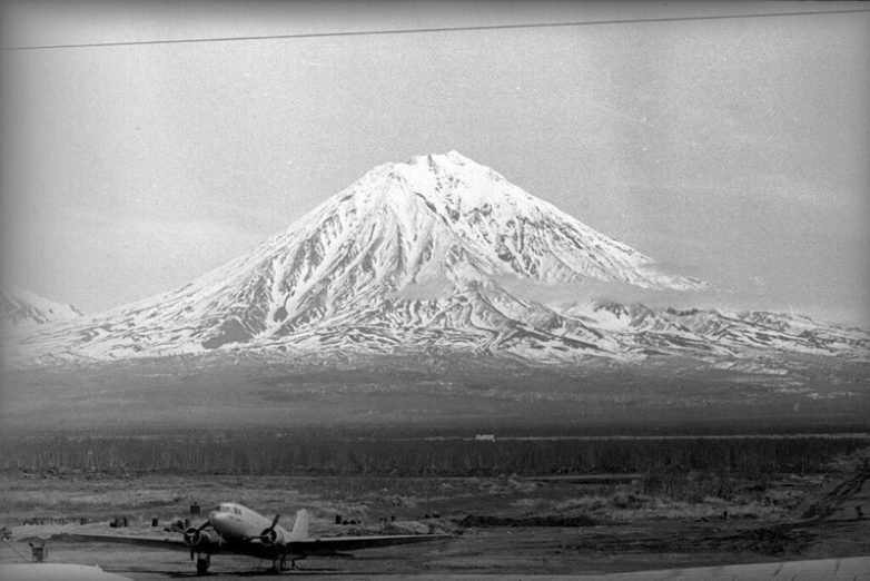 фотография «Где-то в Маньчжурии. Август 1945 года». На самом деле аэропорт Елизово, Камчатка, Карякский вулкан (сопка)