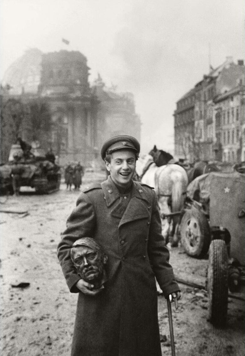 Ещё один знаменитый кадр Халдея. Поэт Евгений Долматовский со скульптурной головой Гитлера в Берлине