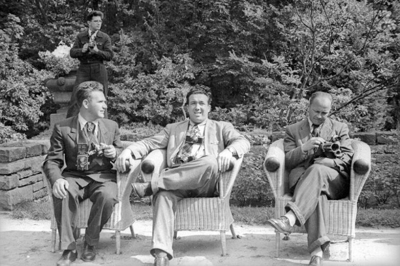Шутливое фото «Малой тройки» на той же Потсдамской конференции. Сидят трое военкоров, слева — сам Евгений Халдей