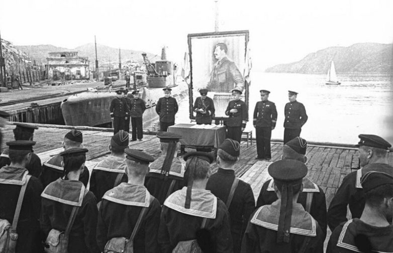 Командующий Северным флотом вице-адмирал Головко награждает личный состав подводной лодки «К‑1» на причале военно-морской базы Северного флота. 1942 год