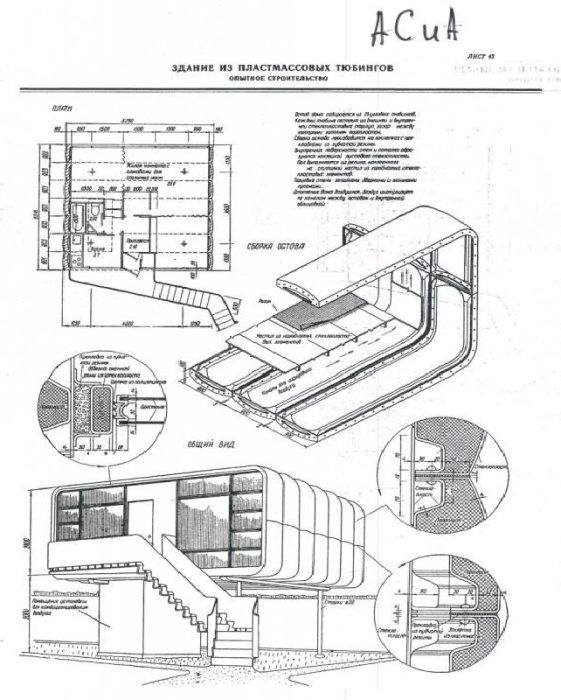 План-чертеж пластмассового дома, разработанный архитектором А. П. Щербеноком и инженером Л. Г. Левинским.