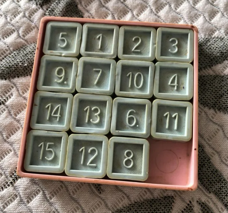 Имя этой «эпидемии» было незамысловатым: «Игра в пятнадцать» или то, что каждому советскому ребенку было известно под названием «пятнашки». Игра выглядела как простая коробочка с пронумерованными кубиками, которые в последнем ряду расположились не по порядку: 13, 15, 14.