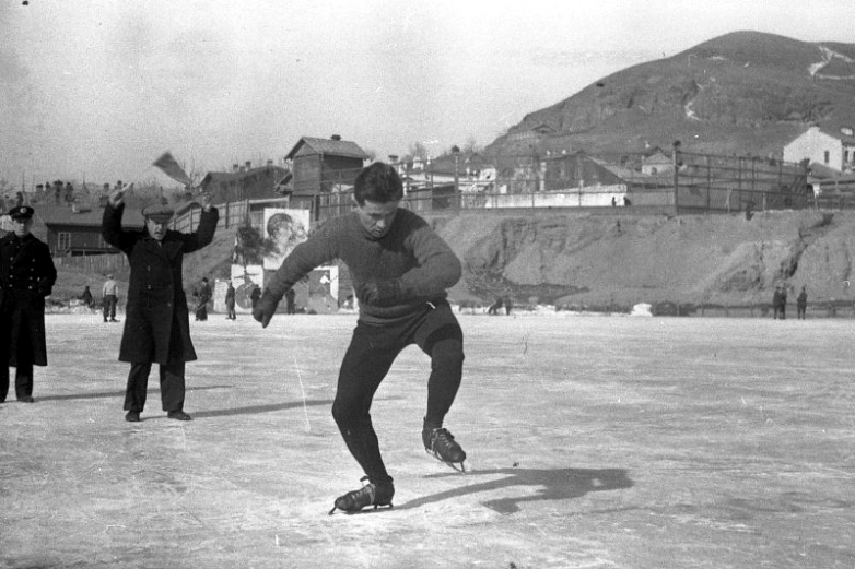 Тренировка конькобежцев (моряков-тихоокеанцев) на городском стадионе