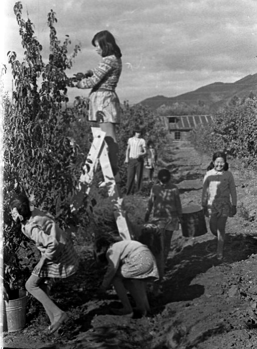 Идет сбор ранетки. В сборе плодов большую помощь оказывают дети школы-интерната. Тува, село Черби.