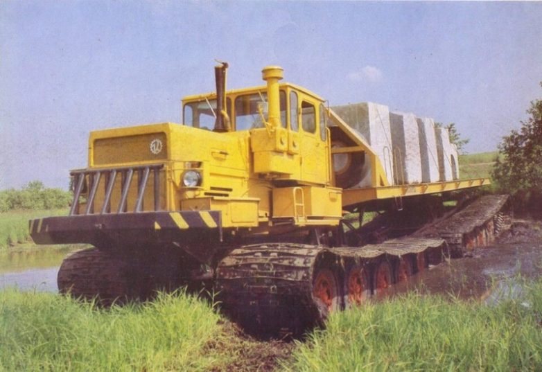 С платформой с кабиной каждая гусеничная тележка соединялась специально разработанной опорой с шарниром, за счет которых происходило маневрирование и отработка неровностей болотохода. Обе тележки были одинаковыми, с некоторыми отличиями (например, у передней ведущие катки располагались спереди, а у задней – позади). На катках крепились резинометаллические гусеницы метр восемьдесят пять сантиметров, что обеспечивало очень низкое давление на грунт (от 0,22 кг/кв.см в «пустом» состоянии болотохода, до 0,38 кг/кв.см в «груженом»).