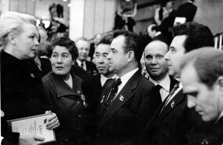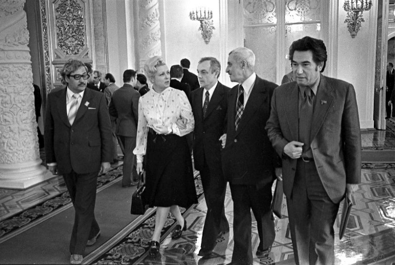 Группа кинематографистов, делегатов Третьего съезда Союза кинематографистов СССР в Георгиевском зале Московского Кремля, в том числе актриса Вия Артмане, актер Кирилл Лавров, писатели Константин Симонов и Чингиз Айтматов. 1976 г.