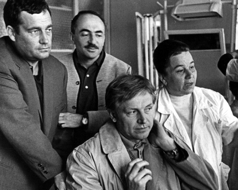«Июльский дождь». Слева направо: А.Митта, М.Хуциев, Ю.Визбор, Г.Дашевская 1966 г.
