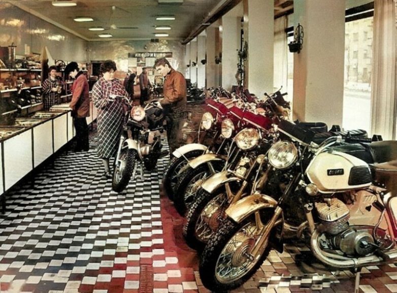 Продажа мотоциклов в магазине Спортивные товары, 70-е годы.