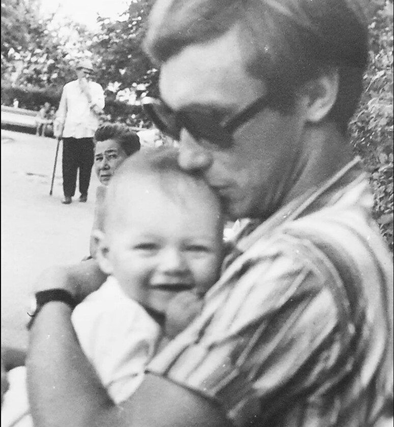 Олег Янковский с маленьким Филиппом на руках, 1960-е годы