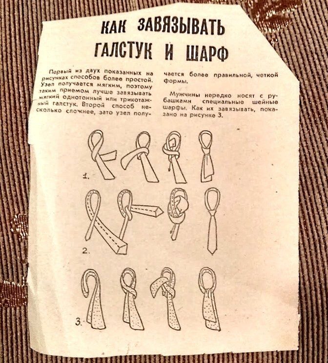 В женских журналах того времени частенько печатали инструкции по завязыванию узлов самых разных видов. Иногда также эти инструкции дополняли рассказом о том, как правильно сочетать галстук с костюмом и рубашкой.