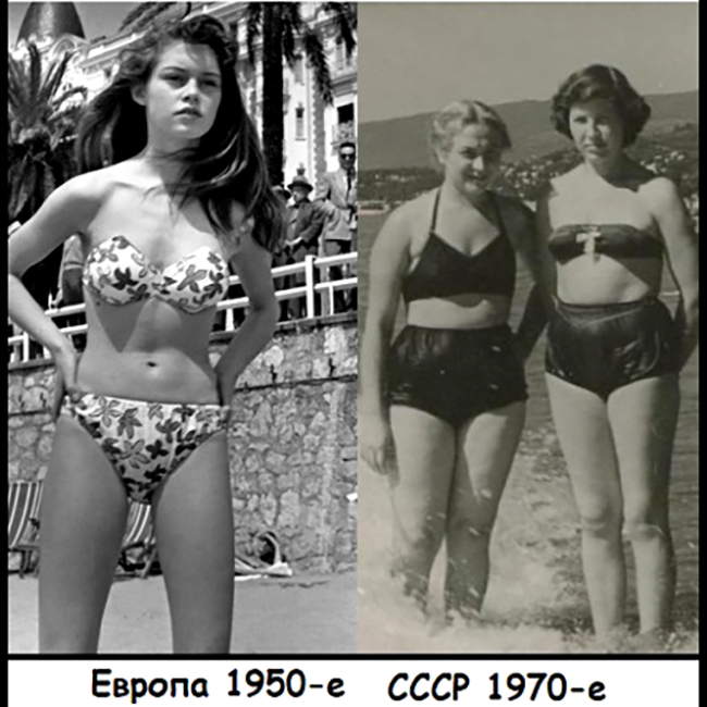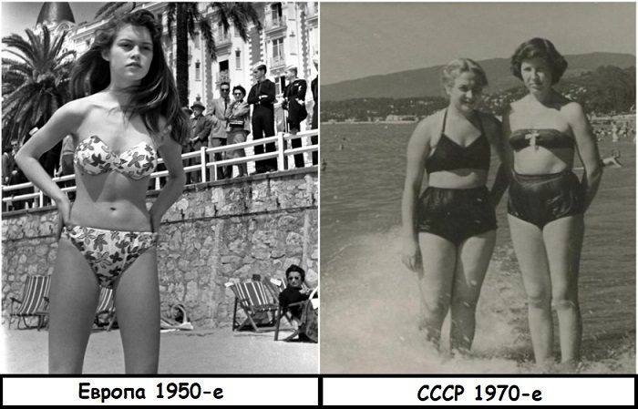 С купальниками дела обстояли примерно так же, как и с нижним бельем. В то время как за границей юная Брижит Бордо вовсю разгуливала в бикини на набережной Круазет в 1955 году, советские женщины до 1970-х годов вынуждены были носить закрытые мешковатые купальники, которые даже отдаленно не напоминали женственные аналоги, популярные в зарубежных странах. В такой пляжной одежде сложно было выглядеть привлекательно – она не только не украшала свою хозяйку, но еще и нещадно портила фигуру, добавляя несколько лишних килограммов.