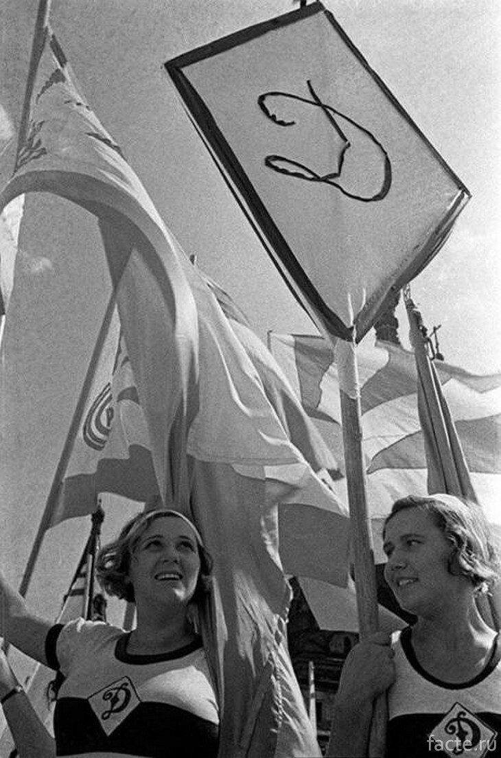 Физкультурный парад на Красной площади. Выступление девушек с флагами. 1935