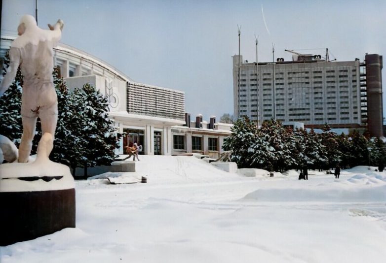 На первом плане занесенная снегом площадка перед Дворцом спорта со скульптурной группой «Футболисты», на дальнем плане здание гостиницы «Интурист»