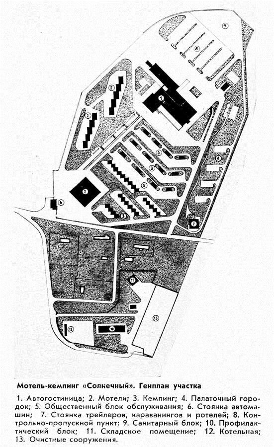 Комплекс назвали «Солнечный» и его проектированием занималась большая группа архитекторов: В.Д. Шер, В. Бломериус, Л. Оршанский, И. Фокина, В. Старостин и М. Воробьёва, руководил зодчими Р. Н. Гвоздев. Они сообща придумали большой комплекс, где был палаточный городок, мотель, кемпинг и стоянки для разных видов машин. От привычных легковушек до трейлеров и ротелей (передвижные отели).