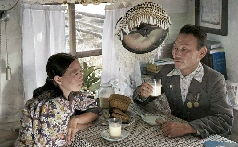 Эвенки-колхозники, супруги Мирошко: Степан Николаевич (охотник-стахановец) и Екатерина Григорьевна (доярка-стахановка) за утренним завтраком в своем новом доме. 1950 г.