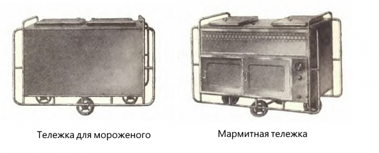 Чуть позже появился еще один вид тележек для мороженого, но новым его назвать было сложно. Как внешне, так и конструктивно, это устройство было очень похоже на мармитную тележку, которая применялась для мобильной торговли продуктами в подогретом состоянии — сосисками, пирожками, котлетами и пр.