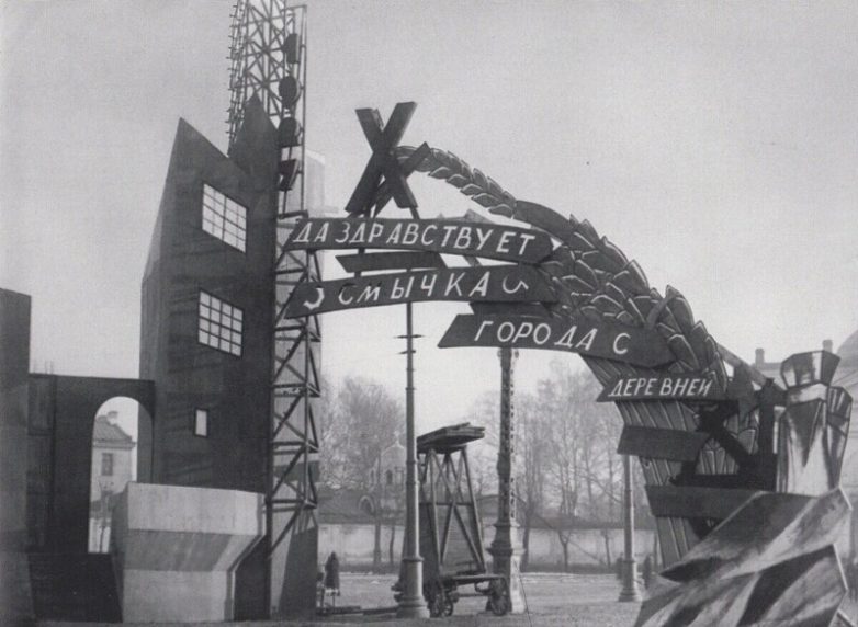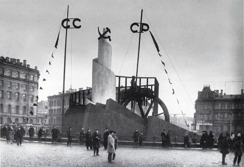 Не будем далеко уходить с площади Восстания и посмотрим, как власти решали обыграть памятник Александру III к 10 годовщине революции. Инсталляция вокруг памятника олицетворяла собой клетку, в которой сидит монарх.