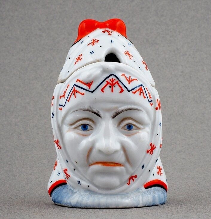 Горчичница в форме головы старухи в платке (почему-то вызывает ассоциации со старухой из «Сказки о рыбаке и рыбке») лично меня пугает. Конечно, выполнено мастерски. Но если такая штука будет стоять на столе и смотреть в глаза, пропадет всякий аппетит.