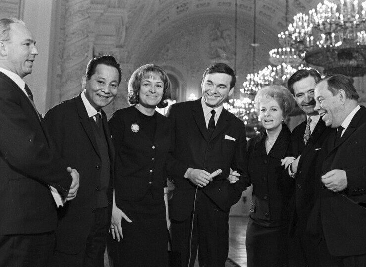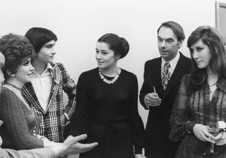 Итальянская актриса Джина Лоллобриджида с сыном и советские актеры: Валерия Заклунная, Алексей Баталов и Ирина Мирошниченко, 1973 год
