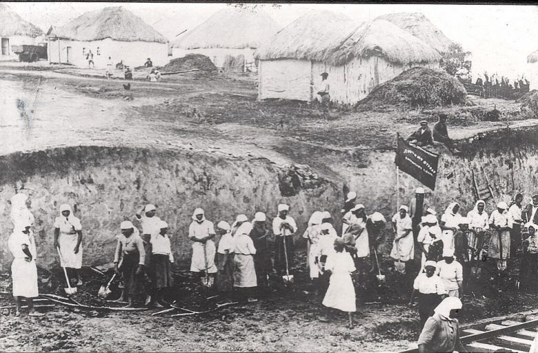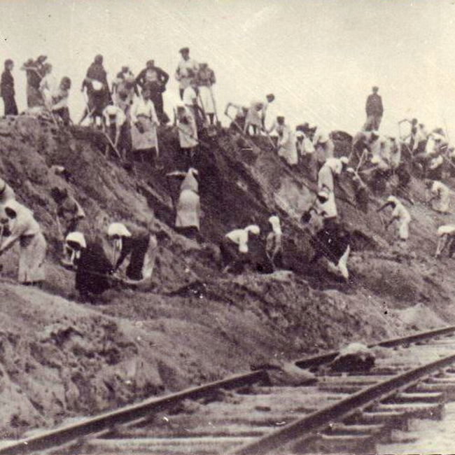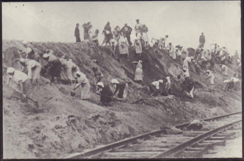 Земля была сухая и твёрдая как камень. Чтобы не выбиваться из сил, менялись инструментами. Рядом с нами трудились военные, которые укладывали шпалы, закрепляли рельсы… Работать приходилось с утра до вечера под палящим солнцем, допуская лишь короткие передышки. От усталости валилась с ног… Самым трудным была трамбовка земли деревянными столбами, так как к вечеру руки покрывались кровавыми мозолями, ныло всё тело.