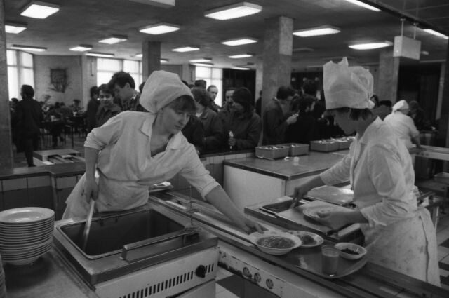 Полноценно отобедать за 80 копеек — 1 рубль было вполне реальным. Меню было вполне разнообразным: каши шли с разными добавками — варенье, масло, изюм, а сырники всегда были толстенькими и румяными, блинчики подавали с самой разной начинкой, были также вареники, молочные булки, яичница.