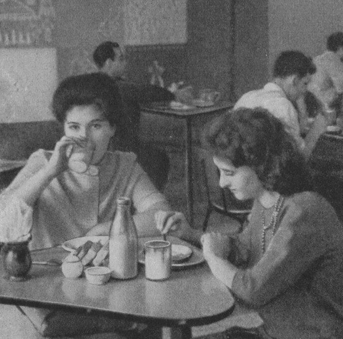 Но пропаганда работала и всё стало намного лучше, когда в городах стали открываться первые молочные кафе — примерно в 60-х. В столичной газете рассказывалось, что даже через витрины можно было увидеть на столиках бутылки с кефиром, сливками, ацидофилином или сливками. И каждый, кто присаживался за столик, мог начинать трапезу со стаканчика вкусного молочного продукта.