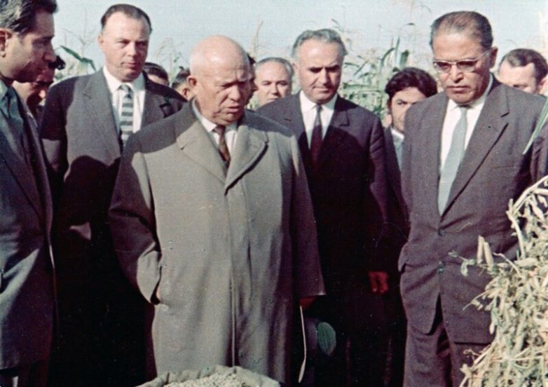 Визит Н.С.Хрущева в Таджикистан, октябрь 1962 год. Справа налево (в шахматном порядке): Д.Расулов, М.Рахматов, С.К.Цвигун, Н.С.Хрущев, И.Коваль