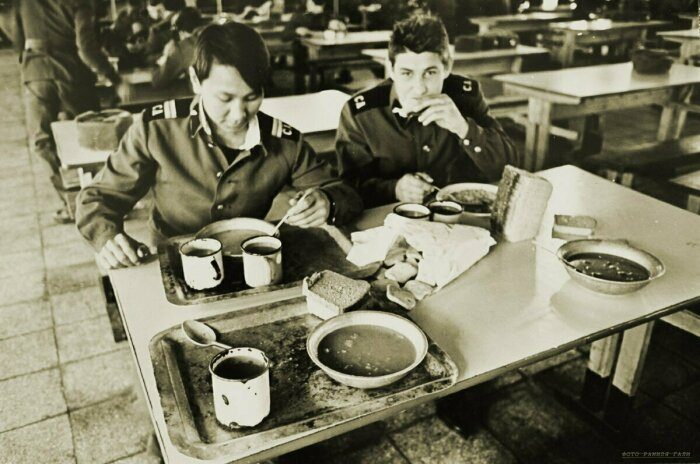 У нас в части была страшная говноеда. Картофель заканчивался к ноябрю — ели порошковый или кубиковый пластмассовый сублимированный картофель синего цвета (жуткая вещь))). Рыба мороженая исчезала к Новому году и посему до лета кормили блюдом из рыбных консервов (подогретая килька в томатном соусе или скумбрия в масле. Изжога гарантирована была)))). Мяса не было вовсе («куски» по-ходу тырили все на корню) — поэтому блюдо состояло из каши (крупы) на комбижире и куска вареного сала с одним прожилком мяса))). Котлеты были два раза за всю службу. К этому всему прилагался мерзкий и всегда одинаковый суп и соленый зеленый помидор. Обязательно компот или чай с кусочками сахара. Неизменные хлеб черняга и мягкий батон! «Вредникам» (заправщикам окислителя и топлива ракетного) давали яйцо, молоко и сгущенку ежедневно. Всем остальным по воскресениям и праздникам официальным. Поэтому после полугода все мы из взвода (другим такое счастье не выпадало практически) питались в гражданской столовой соседней воинской части-завода, в которую ходили через дыру в ограждении (благо недалеко — 300 метров), где можно было сытно поесть на 70 копеек. Это так у нас было. По словам других людей питание было более чем достойное.