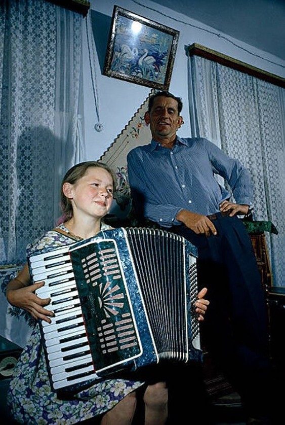 Отец слушает, как его дочь играет на аккордеоне, Сибирь