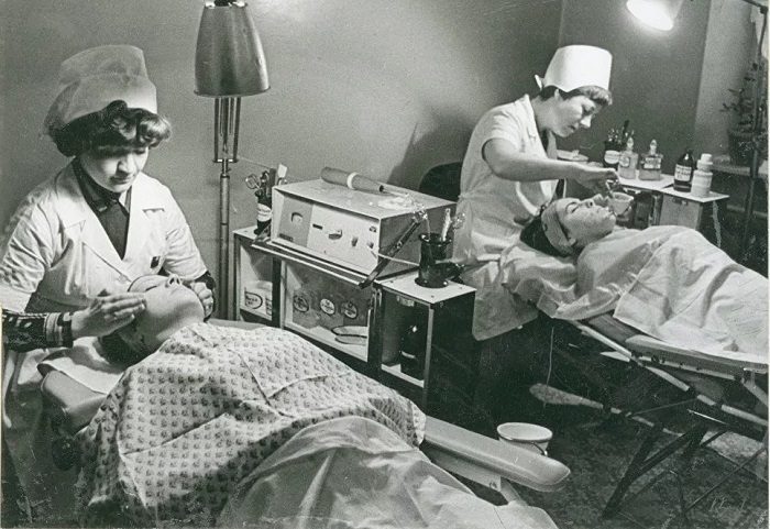 А вот с косметологическими процедурами было сложнее: только в крупных городах они были доступны обычным женщинам. Например, в парикмахерских работали импровизированные косметические кабинеты, предлагались услуги по ручной чистке лица, массажа или нанесения маски, а в некоторых из них можно было пройти даже омолаживающие физиопроцедуры. Однако чаще всего женщины всё-таки ухаживали за кожей дома своими силами, часто с помощью народных средств.